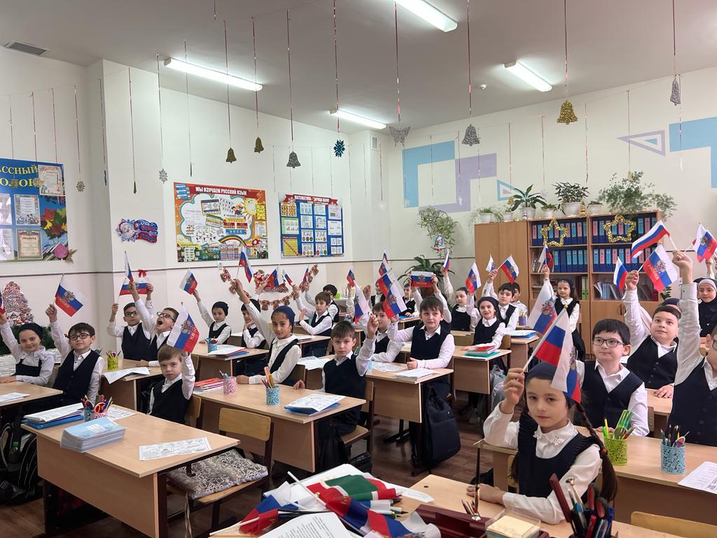 На уроке обучающимся показали видеоролик, благодаря которому они узнали больше о размерах нашей страны: если лететь на самом быстром самолете с запада на восток, то путешествие займет 10 часов. Что в России живут представители почти 200 разных народов. И у каждого из них – своя культура, обычаи и традиции. При этом все россияне подчиняются главному закону — Конституции Российской Федерации.