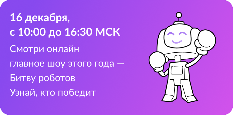 16 декабря с 10:00 до 16:30 состоится главное шоу этого года "Битва роботов". Ссылка на прямую трансляцию мероприятия в сети «Интернет» по адресу https://vk.com/video-219465931_456239497