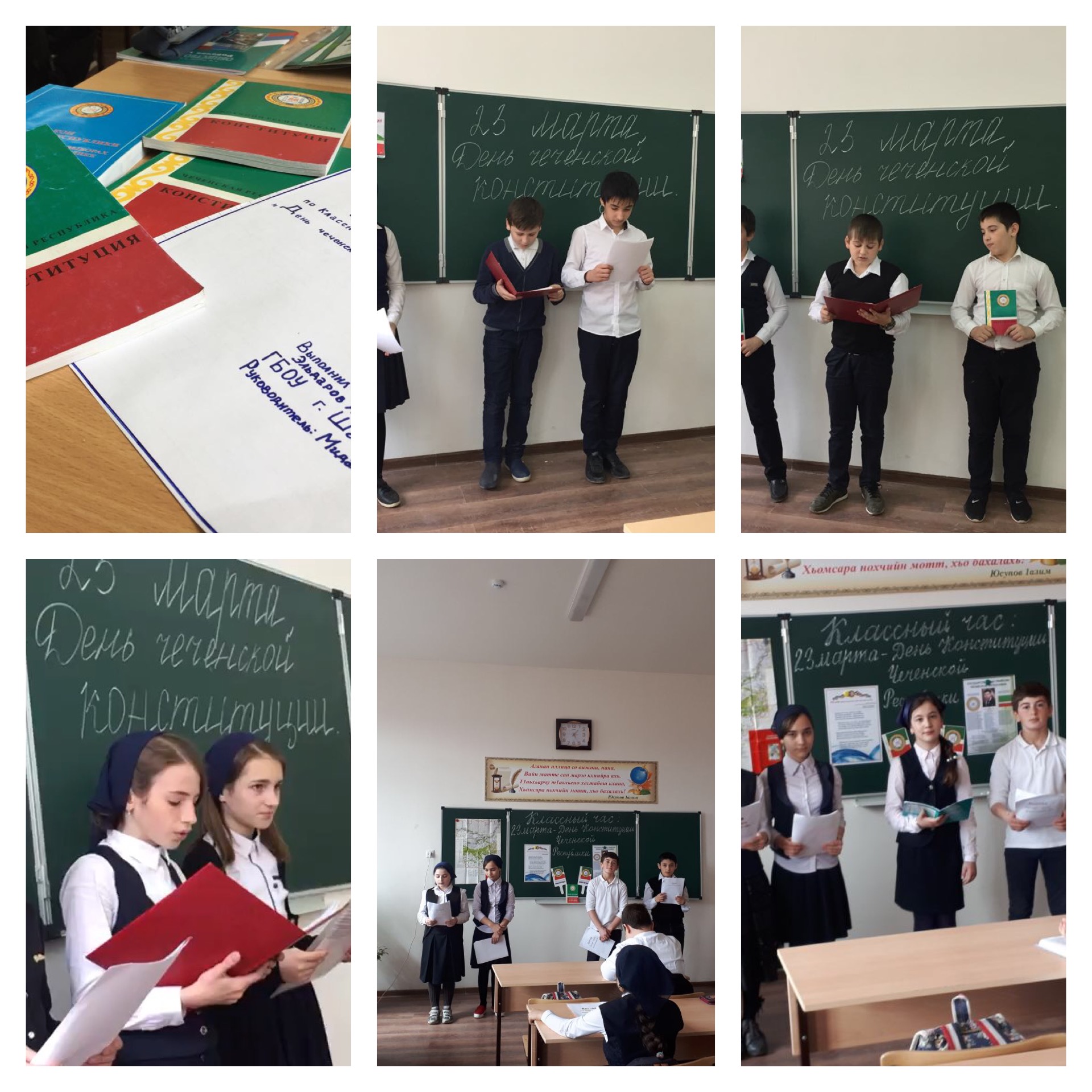23.03.2018В соответствии с планом работы ЦО с 19 по 22 марта 2018 года были проведены классные часы, посвящённые Дню Конституции ЧР. Они прошли с 1 по 10 классы. Классные руководители провели опрос среди учащихся о Конституции ЧР. Обучающиеся показали хорошие знания.